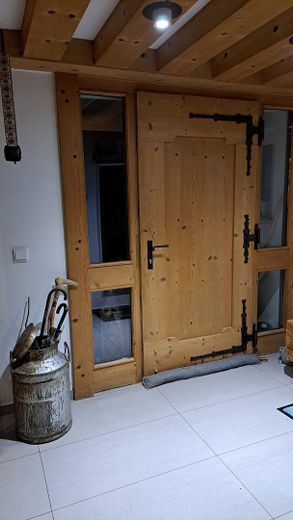 Nebenan befindet sich der geräumige Wohnbereich mit handbehauener Sichtbalkendecke und einer Deckenhöhe von 3 - 5 Metern. Auch in diesem Raum ist ein Kaminofen- Anschluss vorhanden.