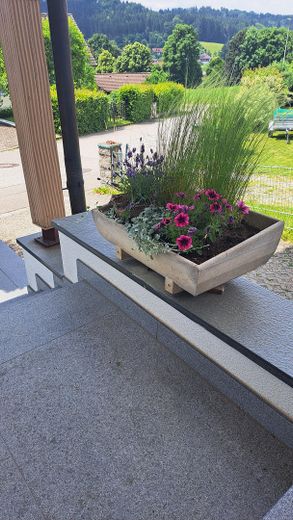 - liebevoll angelegter Garten auf mehreren Ebenen