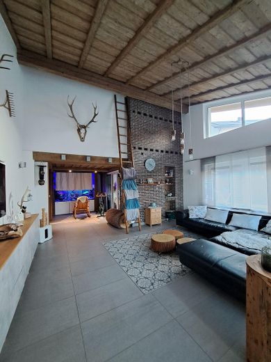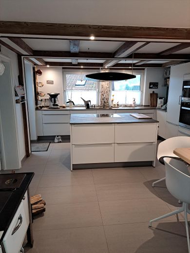 Herzstück des Hauses ist eine moderne weisse Küche mit Kochinsel und Stein- Arbeitsplatte. Im gleichen Raum befindet sich ein gemütlicher Essbereich mit Holzkochofen, der zu gemütlichen Treffen für eine grosse Familie oder Freunde, einlädt.