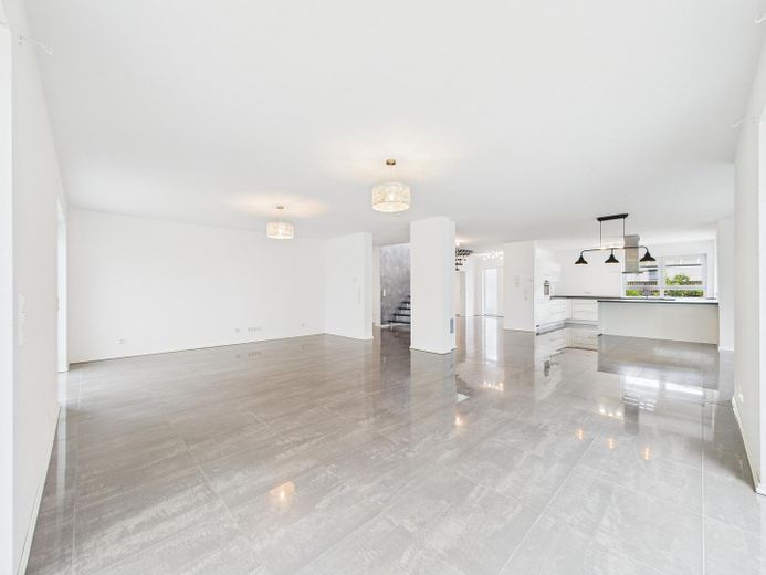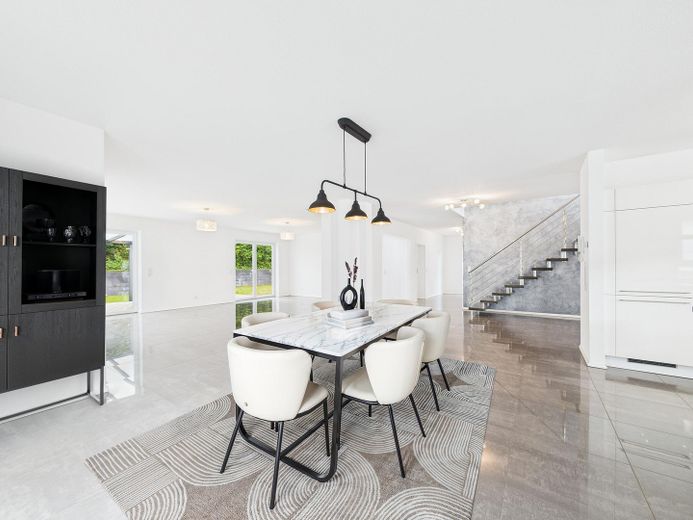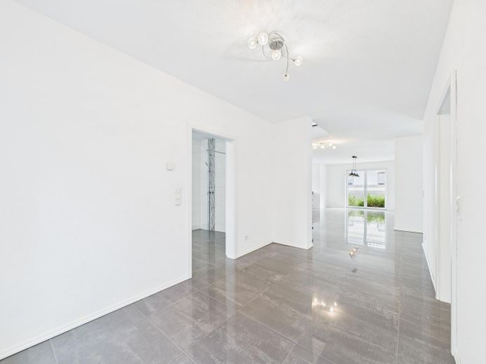 Erdgeschoss: Offener Grundriss mit großzügigem Wohn- und Essbereich sowie angrenzender Küche. Zusätzlich befinden sich hier ein Schlafzimmer, ein Duschbad und ein Waschraum mit direktem Zugang zur Garage.