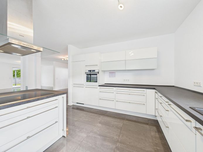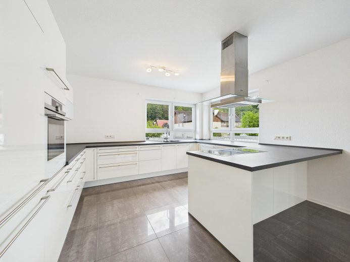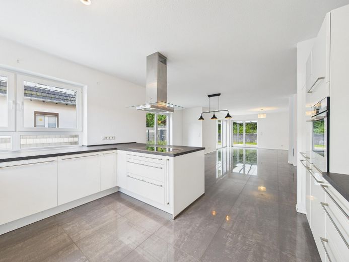 Küche: Offene, moderne Einbauküche in Weiß mit hochwertigen Siemens-Geräten