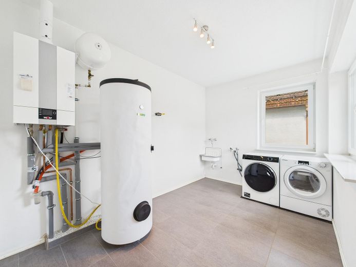 Heizung: Effizientes Gas-Brennwertgerät in Verbindung mit Fußbodenheizung im gesamten Haus