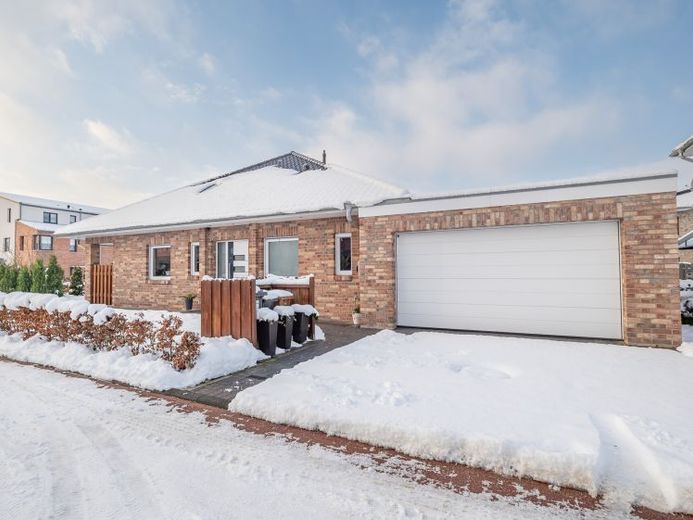 Ergänzt wird das Raumangebot durch einen Hauswirtschaftsraum mit Anschlüssen für Waschmaschine und Trockner sowie zusätzlichem Stauraum. Von hier aus besteht ein direkter Zugang zur geräumigen Garage mit elektrischem Garagentor und einem weiterem Außenzugang, sodass man bei schlechtem Wetter bequem und trocken ins Haus gelangen kann.