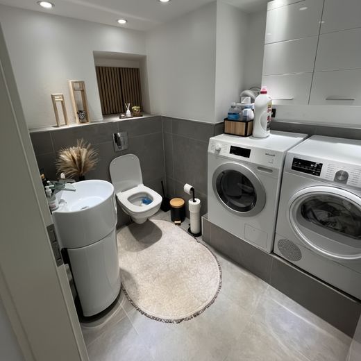 Das moderne Badezimmer ist mit einer bodengleichen, gefliesten Dusche ausgestattet und wird durch ein separates, ebenfalls gefliestes Gäste-WC ergänzt. Maßgefertigte Einbauten und durchdachte Details unterstreichen den exklusiven Anspruch dieser Immobilie.