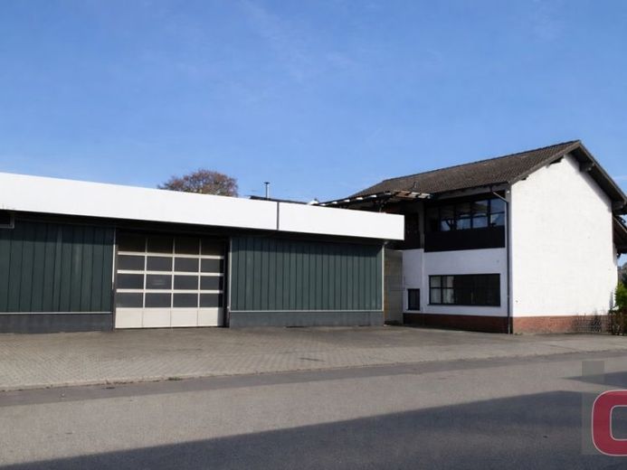 Die angrenzende Gewerbehalle mit Freifläche, Büro, Lager und WC wird derzeit als Autowerkstatt genutzt.