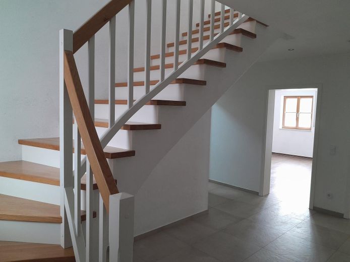 Das Wohnzimmer mit Kaminofen wirkt einladend. Vom Wohnraum und der Küche aus betritt man eine große Terrasse mit Blick in den herrlichen, naturnahen Garten, der an Wald und Wiese grenzt. Im Erdgeschoss befinden sich zudem ein kleines Büro, ein Hauswirtschaftsraum und eine Speise sowie ein Gäste-WC , hier ist bereits eine Dusche vorbereitet, sie lässt sich ohne großen Aufwand installieren. Über eine geschwungene Holztreppe kommt man in das DG mit 3 Räumen, ein Schlafzimmer (mit einem begehbaren Kleiderschrank) sowie 2 weitere Zimmer und einem modernen Bad mit Wanne, begehbarer großer Dusche, einem hochwertigen Badezimmerschrank und Fenster (+ Dachfenster). Über einem der Schlafzimmer befindet sich ein kleiner Speicher.