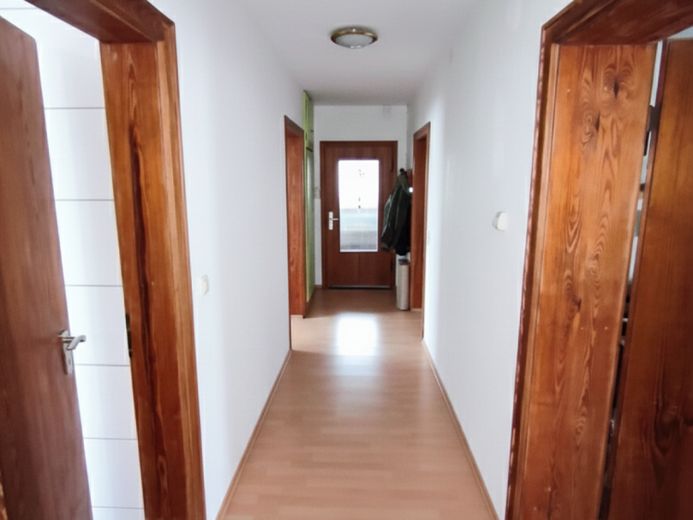 Der zentral gelegene Flur erschließt sämtliche Räume effizient und schafft eine klare Trennung zwischen Wohn-, Schlaf- und Funktionsbereichen.