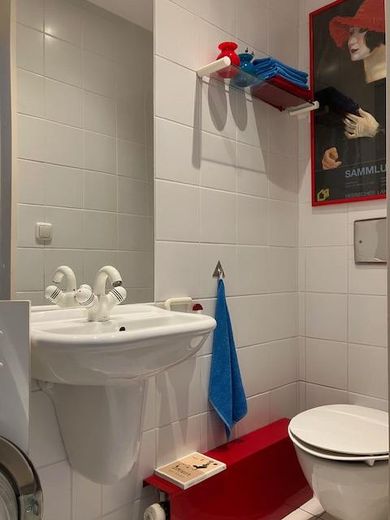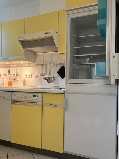 Eine komplette ( ältere ) Einbauküche, kleiner offener Gartenbereich, ein grosser Tiefgaragenplatz, Sauna, Schwimmhalle, Keller.