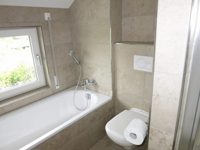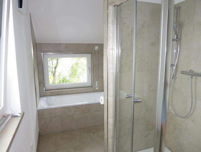 Im Tageslichtbad (zwei Fenster) befindet sich eine Badewanne und eine Dusche.