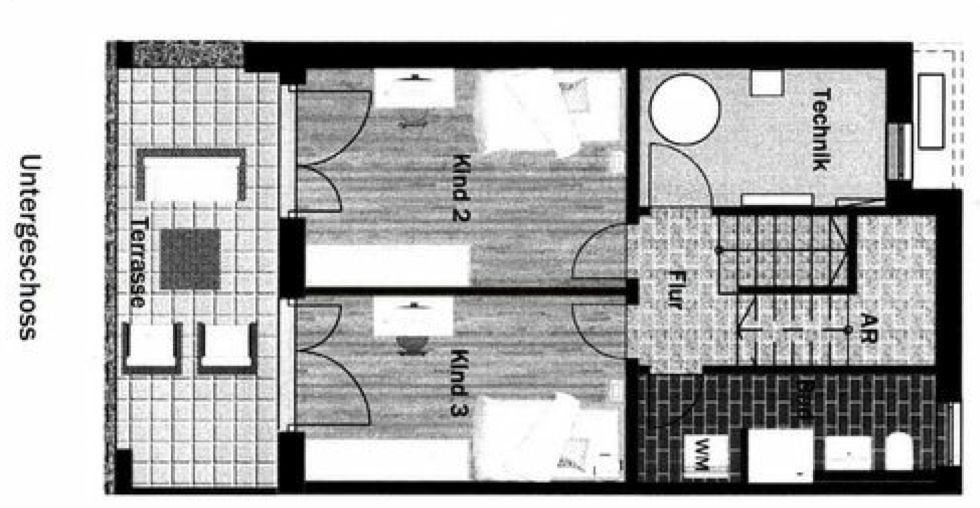 Es verfügt über 5 Zimmer (Wohnen/Essen, Eltern, drei Kinderzimmer), Küche, zwei Bäder, Gäste-WC, Abstell- und Technikraum, die sich auf Unter-, Erd- und Obergeschoss verteilen.