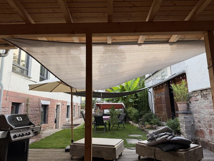 Der Außenbereich überzeugt mit zwei Holzterrassen, einer Pergola, einem großen Vorgarten sowie einem ruhigen Gartenbereich mit Rasen. Das Gebäude steht ca. 16 m von der Straße entfernt, was für viel Privatsphäre und Ruhe sorgt. Ein Stellplatz befindet sich direkt am Haus.