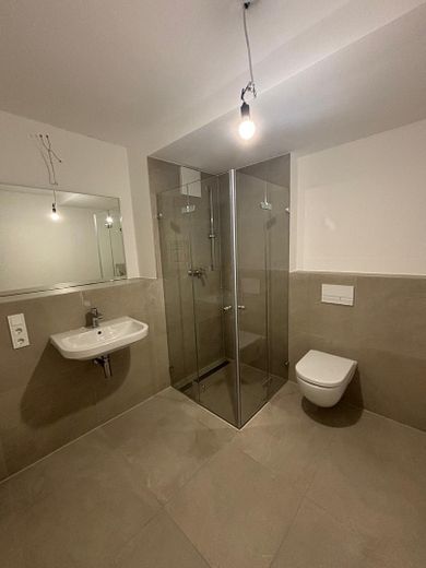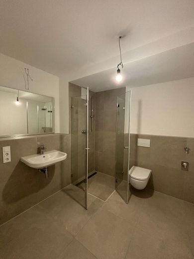 - Stilvolles Badezimmer mit moderner Sanitärausstattung und Duschabtrennungen