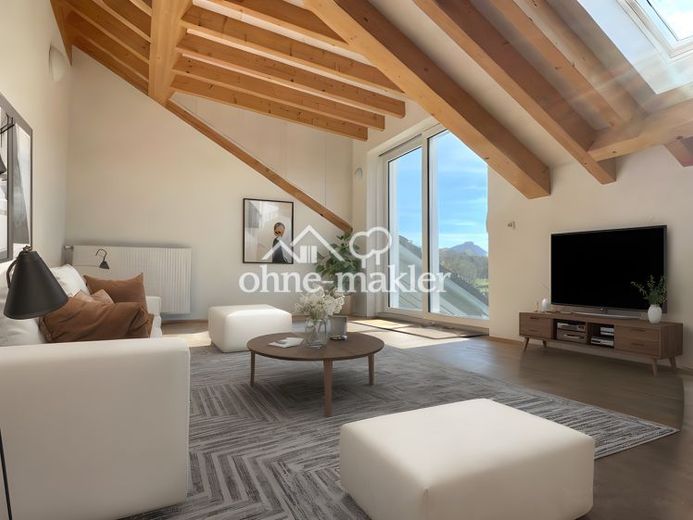 Sie besticht durch ihre hochwertige Ausstattung und die sehr ruhige Ortsrandlage direkt an Wiesen und großem Garten. Stilvolle sichtbare Holzbalken setzen besondere Akzente und verbinden modernen Wohnkomfort mit wohnlicher Gemütlichkeit in hellen freundlichen Zimmern mit Südausrichtung. Dank der Überhöhe wirkt die Wohnung offen, lichtdurchflutet und bietet ein außergewöhnliches Raumgefühl.