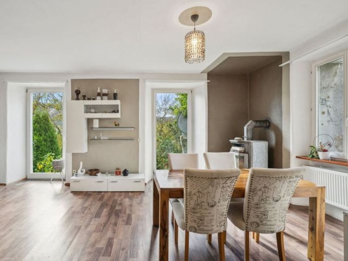 Ein großzügiger Keller bietet zusätzlichen Stauraum. Die massiven, bis zu 60 cm dicken Wände sorgen ganzjährig für ein angenehmes Raumklima. Um die Immobilie auf den heutigen Standard zu bringen, empfehlen sich Modernisierungen an Fassade, Fenstern und Innenausstattung.