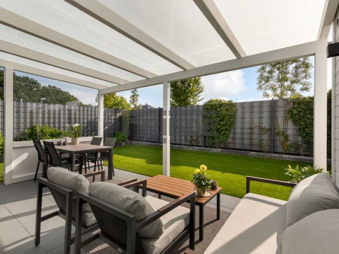 Die Terrasse ist vom Wohn-/Essbereich aus zugänglich. Dank der überdachten Ausführung mit integriertem Schuppen lässt sich der Außenbereich nahezu das ganze Jahr über nutzen – ideal für gemütliche Grillabende, Familienfeiern oder einfach entspannte Stunden im Freien. Der Garten wurde pflegeleicht angelegt, ist ansprechend gestaltet und verfügt über eine automatische Bewässerung.