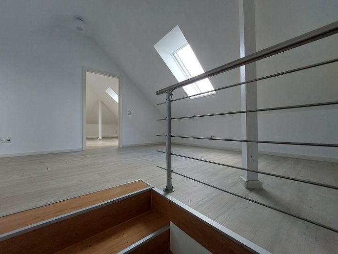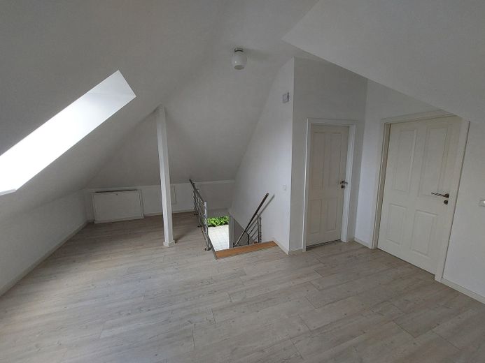 Die hellen Zimmer im Obergeschoss bestechen durch Großzügigkeit und sichtbare Balken. Das dortige Bad ist mit Dusche, WC und Waschbecken komplett ausgestattet, zwei Fenster sorgen für Belüftung und Tageslicht. Eine Galerie, die sich als Arbeitsplatz oder Leseecke eignet, rundet das stimmige Wohnkonzept ab.