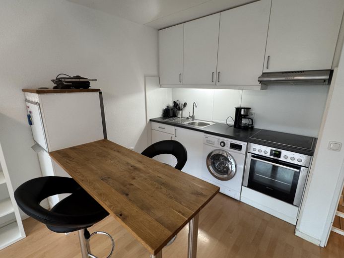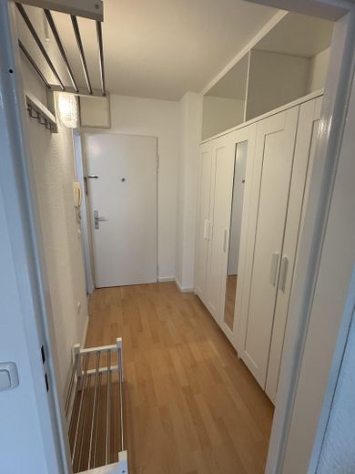 Die Wohnung ist möbliert inkl. Geschirr und Besteck, einigen Küchengeräten, Kühlschrank und Fernseher. Im Flur befindet sich ein großer Einbauschrank.