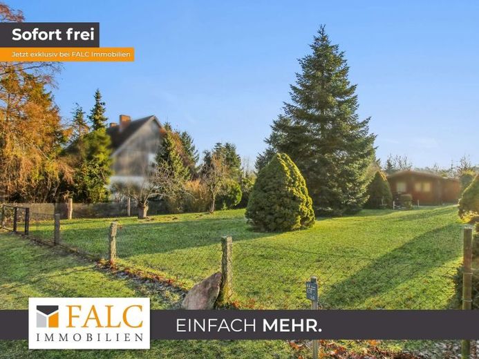 Gehen Sie ein paar Schritte hinein, begleitet von einer gepflegten Rasenfläche und gewachsenem Baumbestand. Einzelne größere Nadelbäume sowie weitere Gehölze strukturieren das Grundstück und schaffen natürliche Bereiche, die sich gut als Spielzone, Gartenbereich oder ruhiger Rückzugsort anlegen lassen. Die Fläche wirkt überwiegend eben und gut begehbar, was die spätere Planung und Nutzung erleichtert.