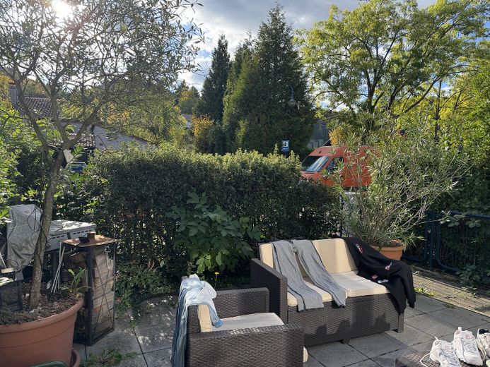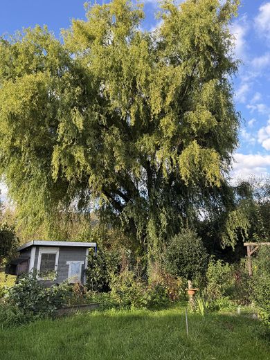 Es befindet sich ein kleines Gewerbe auf dem Grundstück, dahinter ein großer, sehr schöner Garten, der mit genutzt werden kann