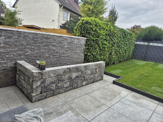 Vorgarten in Vollstein sehr geschmackvoll und hochwertig angelegt. Terrasse mit grossen Platten wurde 2023 saniert. Grenzmauern mit hochwertigen Vollsteinriemchen verziert. Neuer Garten Zaun der Firma Leggi in Anthrazit und Tor nach aussen. Neue Haustüre 2020.
