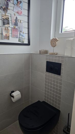 Ebenso der Designkamin NP 14.000 Euro im Wohnzimmer. Das Gäste WC wurde ebenso 2023 saniert ist mit hochwertiger schwarzer Keramik versehen worden.