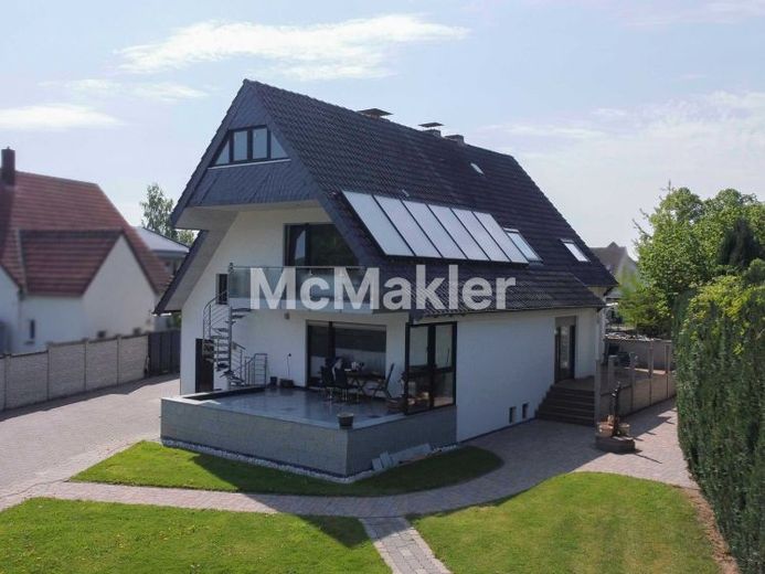Das Haus wurde ursprünglich im Jahr 1960 errichtet und 1977 durch einen Anbau erweitert. Heute präsentiert es sich als vielseitig nutzbares Zweifamilienhaus mit ca. 185 m² Wohnfläche, das sich ebenso problemlos als großzügiges Einfamilienhaus gestalten lässt. Beide Wohneinheiten – jeweils mit 2 bis 3 Zimmern, eigenem Bad und Küche – bieten Zugang zum weitläufigen Garten: entweder direkt über eine Terrasse oder über eine Wendeltreppe vom Balkon aus.