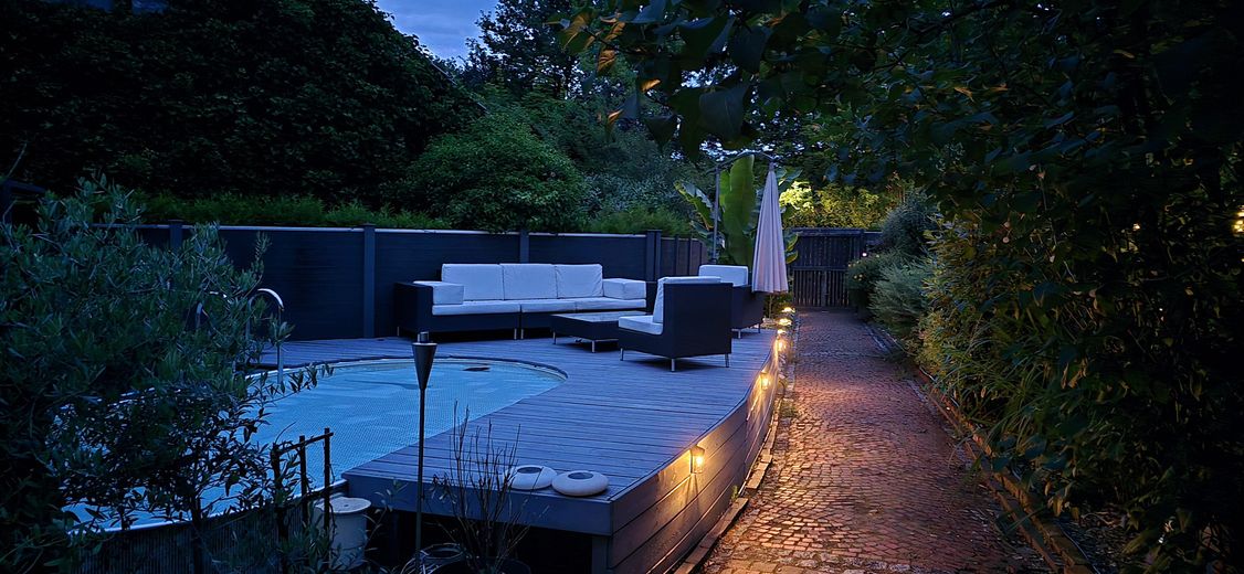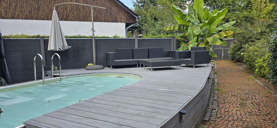 • eine zweite Terrasse direkt vor dem Haus rund um den Pool
