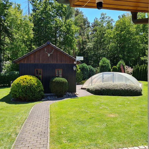 Im Außenbereich verfügt das Anwesen über eine eigene großzügige Grundstückseinfahrt mit elektrischen Schiebetor. Es sind verschiedene Nebengelasse vorhanden: 2 Garagen, ein Carport mit 2 Stellplätzen, eine Werkstatt, ein Gartenhaus, ein Holzlagerhaus, ein überdachter Pool und ein großzügig angelegter Garten zum Liegen und Entspannen vorhanden. Zusätzlich laden Sitzflächen mit einer Terassenüberdachung zum Verweilen ein. Die Rasenpflege übernehmen Rasenroboter.