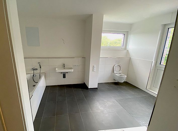 . 14m² Hauptbadezimmer mit Wanne und schwellenloser Dusche, Wandheizkörper, hängendes WC, Aussenfenster; Gäste-WC mit Dusche