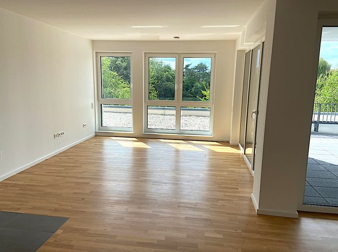 . Wohnzimmer mit offener Küche, Essecke, bodentiefe Fenster; von dort Zugang zum großen Loggia-Balkon, 2/3- überdacht.
