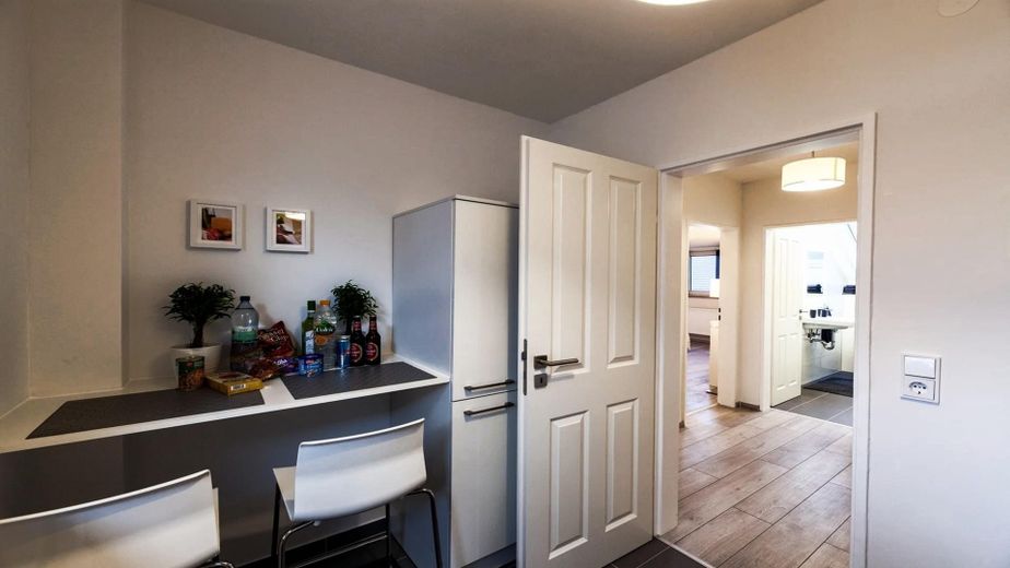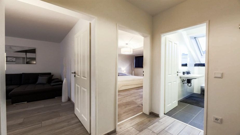 Die moderne Wohnung befindet sich in Porz-Wahnheide. Besonders an diesem Objekt ist die Symbiose aus absolut ruhiger Gegend, die zum Joggen, Wandern und Radfahren einlädt und der optimalen Anbindung an den Flughafen Köln/Bonn und die Messe Köln. Der 3km entfernte Flughafen ist mit dem Auto in 5 Minuten zu erreichen. Eine Bushaltestelle ist nur 250 Meter entfernt.