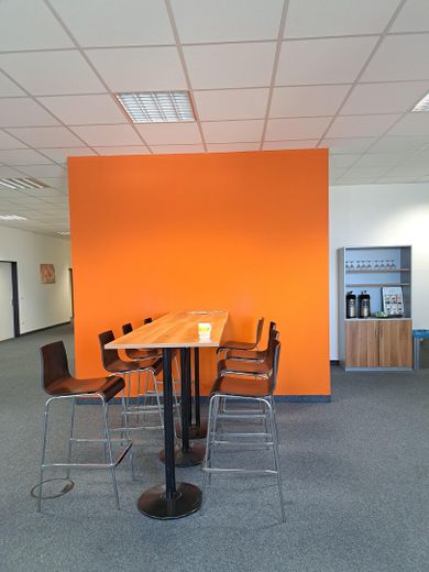 Die aktuelle Fläche des abgeschlossenen Raums kann auf Wunsch vergrößert werden, auf der Etage gibt es Potential sowie dazugehörige Freiflächen mit Kaffee- und Besprechungsecken.