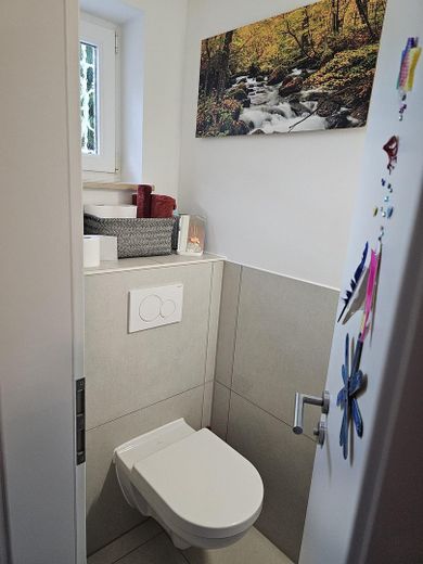 Die Immobilie verfügt über eine hochwertige, offene Einbauküche mit großzügigem Grundriss. Zur Ausstattung gehören außerdem drei WCs und zwei Bäder, die eine komfortable Nutzung für Familien ermöglichen. In zwei Zimmern des 1. und 2. Obergeschosses sorgen passgenaue, hochwertige Einbauschränke für optimale Stauraumnutzung und ein harmonisches Raumgefühl.