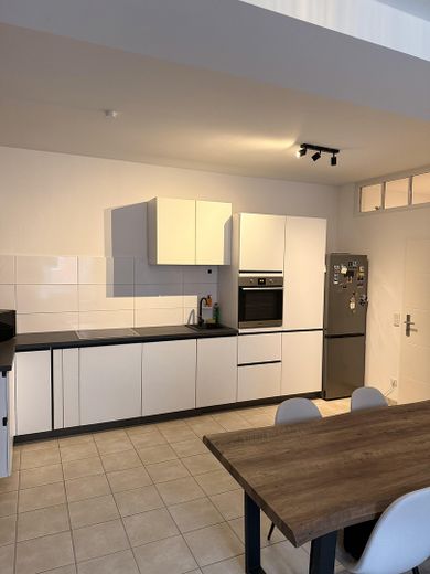 Die Wohnung hat eine offene Küche zum Wohnzimmer; zur optischen Trennung ist der Küchenbereich gefliest, im Wohnzimmer ist der Boden mit Laminat belegt.