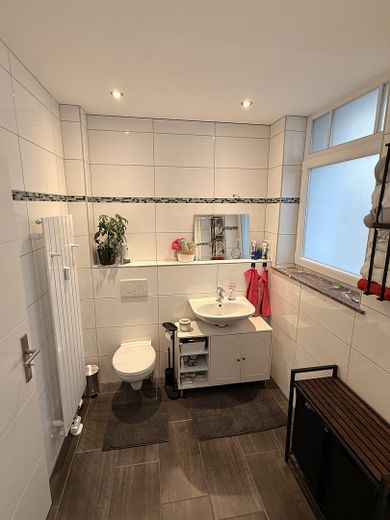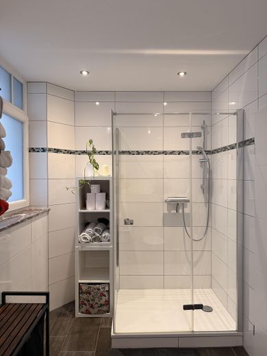 Das liebevoll und großzügig bemessene Tageslichtbad ist mit einer großen Dusche und mit einer Duschkabine aus Glas ausgestattet.
