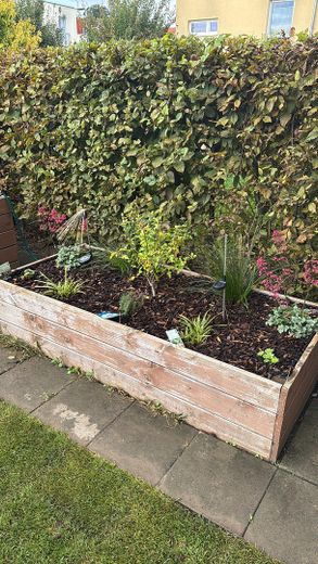 Zwei Hochbeete bieten zusätzlich Raum für Hobbygärtner und ermöglichen es, den eigenen grünen Daumen auszuleben, ohne dass ein hoher Pflegeaufwand entsteht.