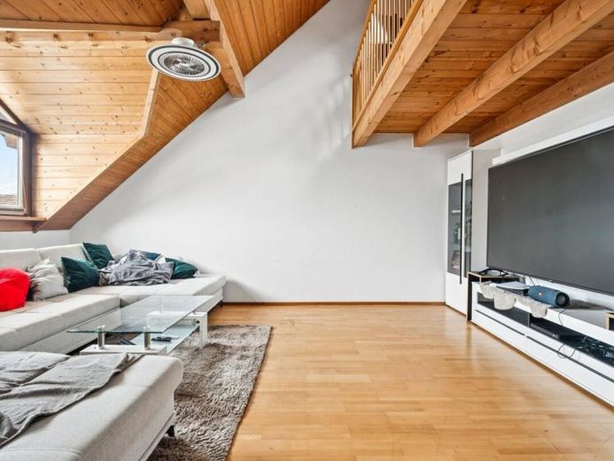 Die Gestaltung mit offenem Wohnraum bis unter das Dach und sichtbaren Holzbalken verleiht der Wohnung einen besonderen Charakter. Die Gasetagenheizung wurde bereits ausgetauscht und befindet sich in einem gepflegten Zustand.