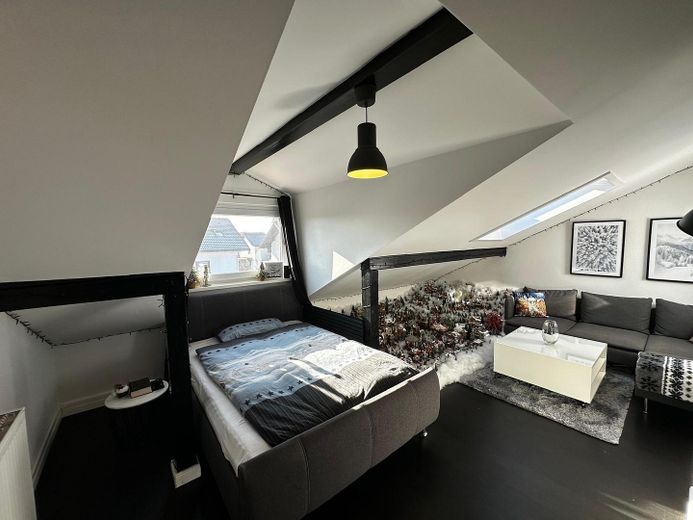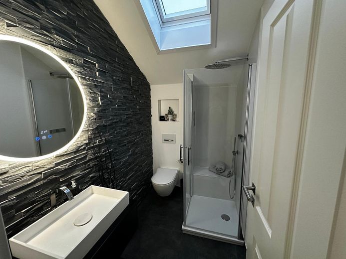 Das Dachgeschoss umfasst insgesamt 33,09 m2 Wohnfläche. Für Helligkeit sorgen eine Gaube sowie insgesamt drei Dachfenster. Hier befindet sich ein weiteres Badezimmer. Hervorzuheben ist auch hier äquivalent zum Badezimmer im ersten Stockwerk die Badgestaltung mit Schiefersteinen. Die in der Glasdusche integrierte Sitzbank sorgt für Entspannung. Des Weiteren wartet ein großzügiges Zimmer auf Sie. Ursprünglich handelte es sich hierbei um zwei getrennte Zimmer. Die Zwischenwand wurde von den aktuellen Eigentümern entfernt. Bereits vorhandene Anschlüsse ermöglichen es auf Wunsch, mit wenig Aufwand eine kostengünstige Trennung des Raumes in 2 separate Zimmer vorzunehmen.