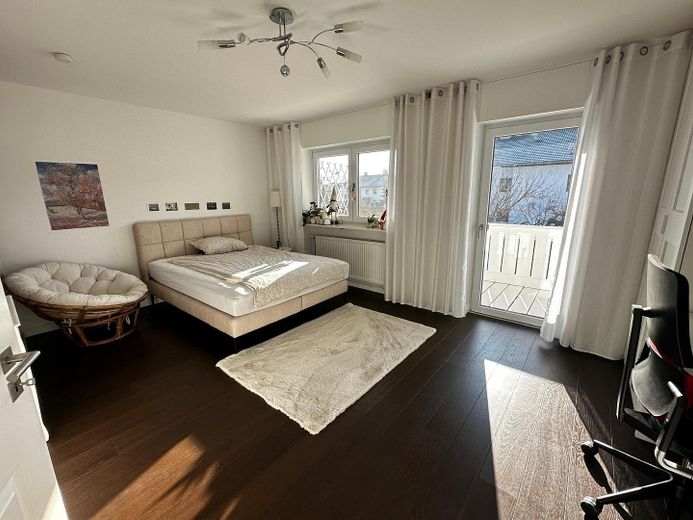 Über eine offene Treppe erreichen Sie das erste Obergeschoss. Dieses besteht aus zwei hellen, geräumigen Schlafzimmern sowie einem Badezimmer. Eines der Zimmer verfügt über einen Balkon mit Bergblick. Für Ihre privaten Wellnessmomente sorgt im Bad zuzüglich zu der Glasdusche eine freistehende Badewanne aus Mineralguss.