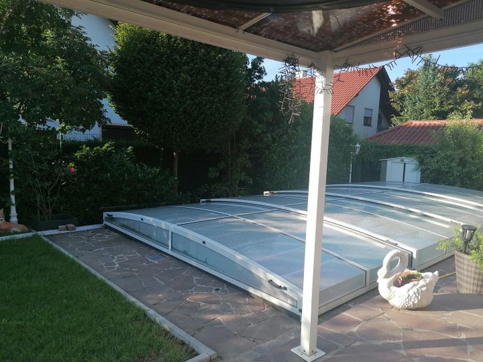 Neu überdachte (Schiebehalle) und erneuerter 8,4 x 4,4 m Pool. Die grosse Garage verfügt über ein elektrisches Tor und ist auch über die Wohnung erreichbar. Eig. grosser Keller.