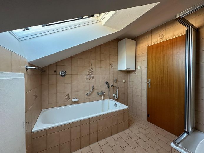 - Badezimmer mit Dusche, Badewanne sowie Platz für eine Waschmaschine/Waschtrockner.