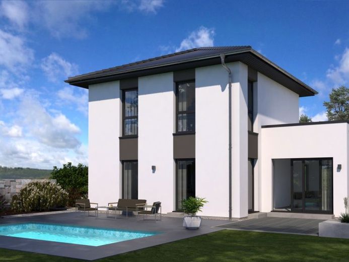 Die quadratische Walmdachvilla wird mit einem Eckanbau optisch und räumlich ergänzt. Der geschützte Eingangsbereich mit Windfang führt in die Diele. Von hier geht es in den offenen Wohn- und Essbereich mit halboffener Küche, von der ein direkter Zugang zum Außenbereich möglich ist. Außerdem befinden sich der ausgelagerte Elternbereich mit Ankleide und eigenem Duschbad sowie Hauswirtschaftsraum und Gäste-WC im Erdgeschoss. Die halbgewendelte Treppe führt in die obere Etage, wo sich eine kleine Galerie befindet. Hier haben die Kinder ihr eigenes Reich. Zwei identisch gespiegelte Zimmer sowie das geräumige Badezimmer sorgen dafür, dass der Nachwuchs sich ungestört entfalten kann.