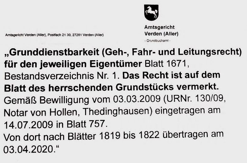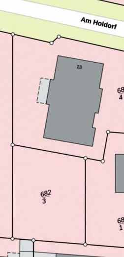 Stattdessen wurde das Grundstück aber erstmal nur amtlich geteilt, eine eigene Hausnummer zugeteilt (Am Holdorf 13a - 682/3) und auf dem ursprünglichen Grundstück (Am Holdorf 13 – 682/4) ein grundbuchlich gesichertes Wegerecht für alle Rechtsnachfolger (1:1 spiegelverkehrt wie nebenan für das Grundstück 682/1) sichergestellt: