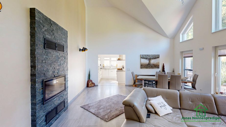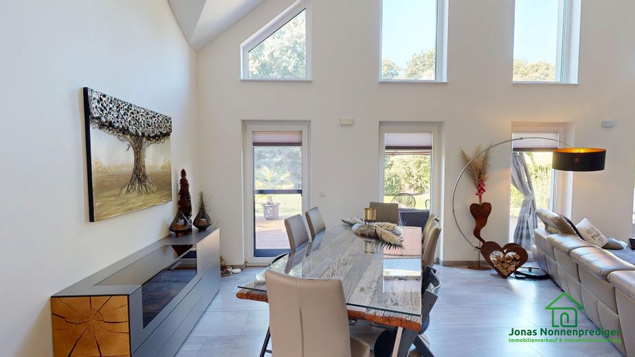 Das Highlight des Hauses ist das großzügige Wohnzimmer mit seiner offenen Decke, die für ein besonders lichtdurchflutetes und beeindruckendes Raumgefühl sorgt.