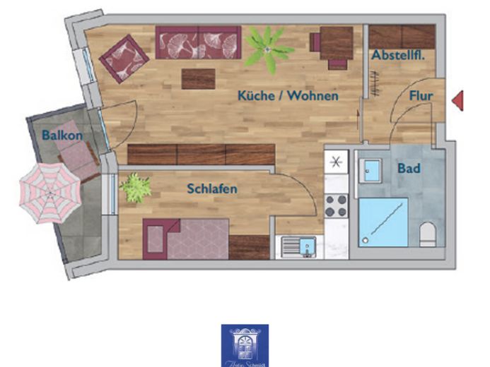 Diese hübsche 2-Zimmerwohnung liegt im 1. Obergeschoss. Im hellen großzügigen Wohnbereich ist die offene Küche mit moderner EBK integriert. Für Entspannung und Wohlbefinden sorgt der gemütliche Balkon. Hier können Sie gemütliche Stunden mit Freunden oder der Familie verbringen. Das Schlafzimmer verfügt über einen optimalen Zuschnitt. Das moderne Bad mit einer ebenerdiger Dusche und einem Handtuchheizkörper ist exklusiv ausgestattet. Der Anschluss für Ihre Waschmaschine sowie ein zusätzlicher Abstellraum zur Wohnung befinden sich im Treppenhaus.
