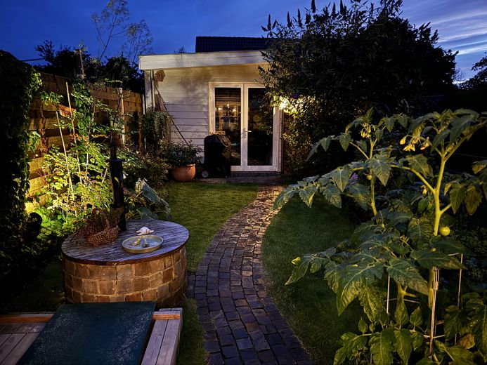 Der Garten ist mit viel Liebe gestaltet und bietet neben Erholungsflächen auch Obstpflanzen, die das naturnahe Wohnen unterstreichen.
