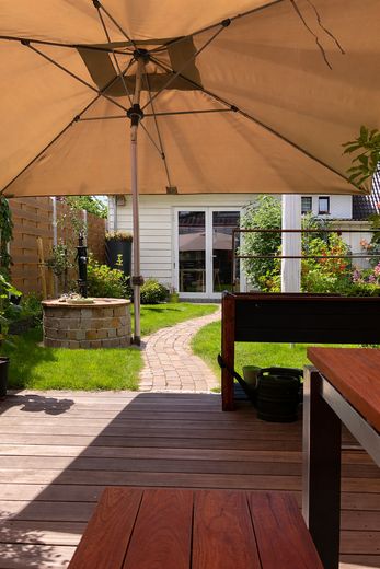 Der Wohnbereich überzeugt durch gute Lichtverhältnisse (4 Dachflächenfenster). Eine großzügige 4m breite Faltschiebetür, verbindet den Innenraum fließend mit der Terrasse und dem liebevoll angelegten, kleinen Garten. Die Westausrichtung der Terrasse sorgt für angenehme Feierabendsonne bis in die Abendstunden. Eine Terrassenüberdachung ermöglicht die Nutzung des Außenbereichs nahezu bei jedem Wetter.