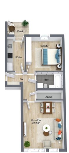 Beim Betreten der Wohnung gelangen Sie in einen freundlichen Flur, von dem aus alle Räume bequem erreichbar sind. Direkt angrenzend befindet sich eine praktische Abstellkammer, die wertvollen Stauraum bietet.