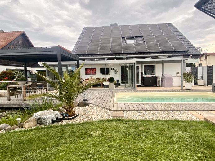 „A+“. Im Jahr 2021/22 wurde eine Solaranlage mit Speicher und Notstromfunktion verbaut und im Carport eine Wallbox angebracht. Ein Doppel-Carport steht Ihnen zur Verfügung. Der liebevoll und modern angelegte Garten lässt keine Wünsche offen. Ein großer Pool inklusive elektrischer Echtglas-Überdachung sorgt an warmen Sommertagen für Abkühlung, der naturbelassene Gartenteich sorgt für Harmonie. Unter der Pergola auf der großen Terrasse, die zum