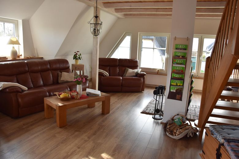 Das Obergeschoss überzeugt durch einen hellen Wohn- und Essbereich mit großen Fensterflächen und schönem Blick auf die Ostsee. Hier befindet sich ebenfalls die offene Küche sowie ein weiteres Badezimmer. Im ausgebauten Spitzboden stehen eine gemütliche Leseecke und ein zusätzliches Schlafzimmer zur Verfügung - auch von dort genießt man einen Blick aufs Meer.